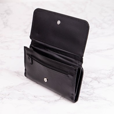Con espacio para billetes, tres tarjetas de crédito, DNI, y monedas.